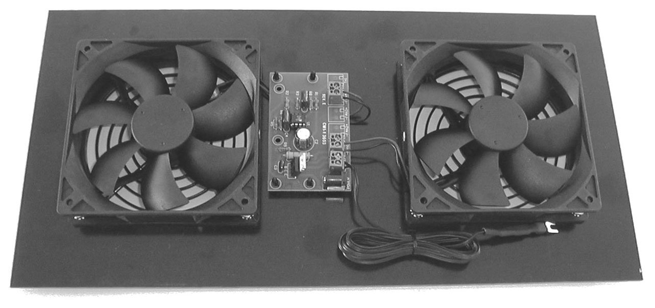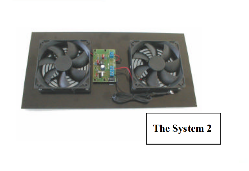 The original System 2 is an all-in-one; the fans and controller are mounted on a gasketed panel. Just cut a 14″ x 5.5″ (approximate – do not cut before receiving unit) hole in the back panel of the enclosure and provide an air input opening. The two thermal sensors are clipped to whatever generates the most heat in the enclosure (video projector, hi-def cable box, or surround-sound amplifier). The sensors adjust the speed of the two exhaust fans automatically and turn them off when the sensed equipment approaches room temperature. Maximum allowed fan speed is low; noise level approaches inaudibility.